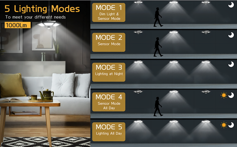 OKanpoko eguzki-mugimendu sentsoredun estalpeko argiak 5 argiztapen modurekin.