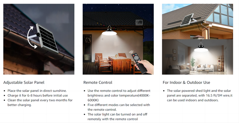 3. IP65 iragazgaitza eta instalazio erraza Eguzki-ukuiluko argiak kanpoko iragazgaitza den argiak IP65 iragazgaitza den diseinua du eta eguzki-panelera 16,4 oineko kable batekin konektatuta dago.