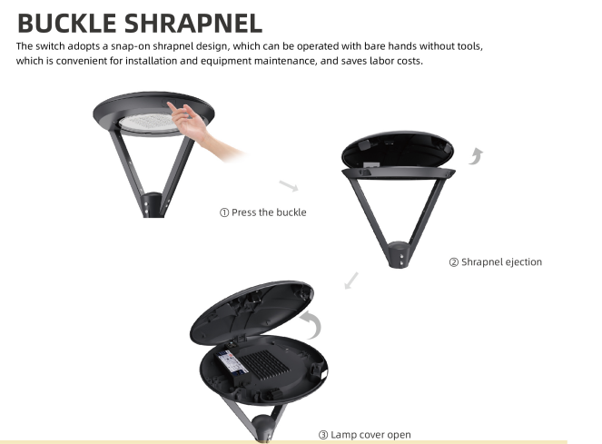 Konexioaren irekiera eta itxiera diseinua, lanpararen estalkia ireki eta itxi daiteke angelu handi batekin,